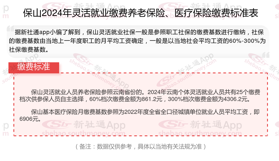 以上就是带来保山灵活就业社保缴费标准相关知识,内容供参考,希望对你有帮助,欢迎关注/下载新社通APP解锁更多社保专业资讯。