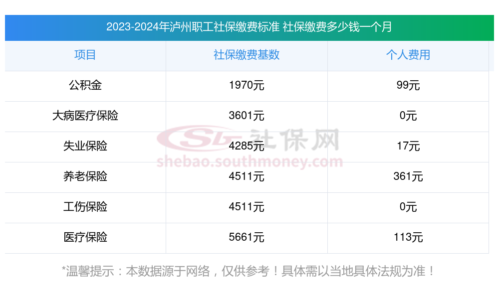 泸州社保一个月交多少钱,个人缴纳多少钱一个月?下面和新社君一起来看看泸州最低标准社保费用明细参考,新社通app-社保缴费查询工具提供的最新数据如下: