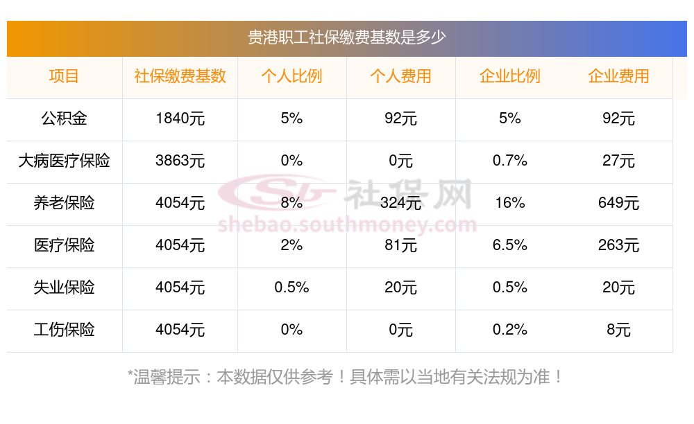 贵港缴费社保比例一览 社保公司和个人各交多少?下表是2024-2025年贵港社保费用明细参考,新社通app-社保缴费查询工具提供的最新数据如下: