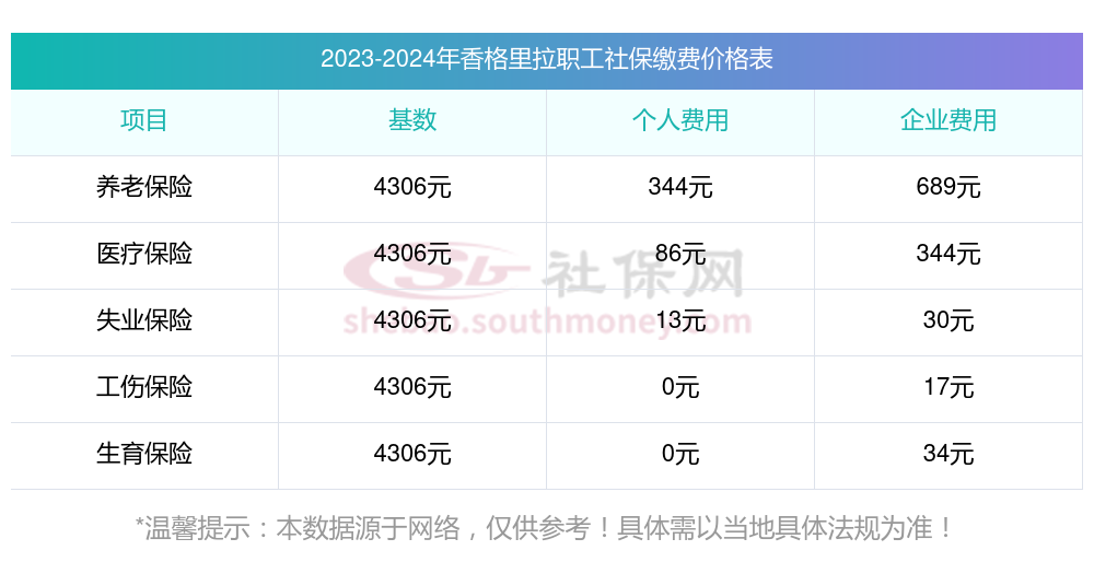 香格里拉职工社保缴费多少钱?香格里拉职工社保缴费基数最新参考为:3579.00,具体如下: