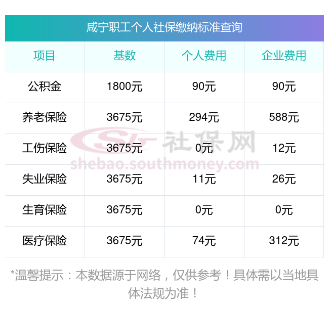 湖北咸宁缴费社保比例一览 社保公司和个人各交多少?下表是2024-2025年湖北咸宁社保费用明细参考,新社通app-社保缴费查询工具提供的最新数据如下:
