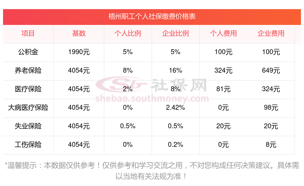 梧州五险要扣工资多少钱一个月?梧州缴费社保比例一览社保公司和个人各交多少?下表是2024-2025年梧州社保费用明细参考,新社通app-社保缴费查询工具提供的最新数据如下:
