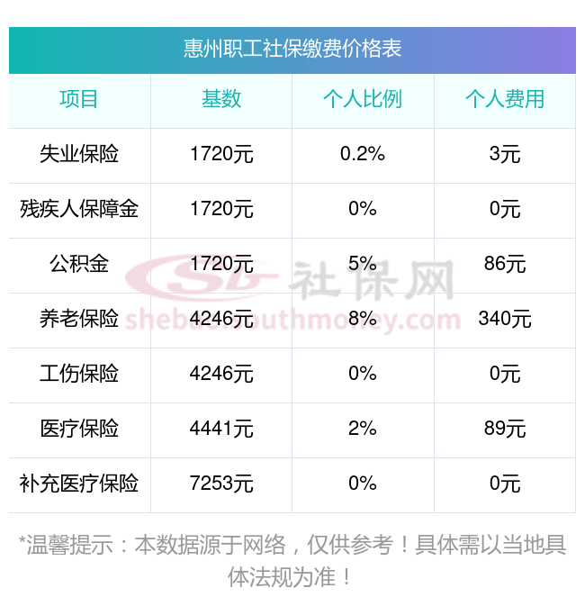 2025年惠州社保缴费多少钱?下表是2024-2025年惠州社保费用明细参考,新社通app-社保缴费查询工具提供的最新数据如下: