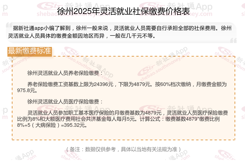 2025徐州灵活就业社保缴纳基数是多少?徐州灵活就业人员社保交15年领多少?根据新社通app-社保缴费查询工具提供的2025社保缴费标准详情数据: