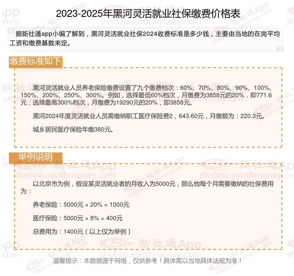 缴费标准最新公布!黑河2024-2025年度灵活就业社保缴费基数明细来了,根据新社通app-社保缴费查询工具提供的2025社保缴费标准详情数据: