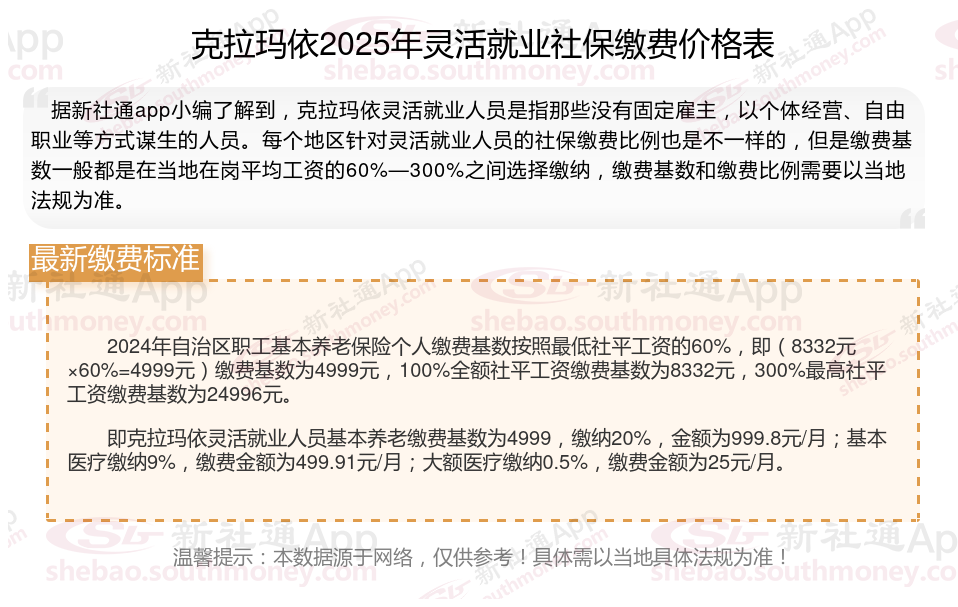 以上就是克拉玛依灵活就业社保缴费的全部内容,数据及内容供参考!希望对你有帮助,欢迎关注新社通解锁更多社保专业资讯。