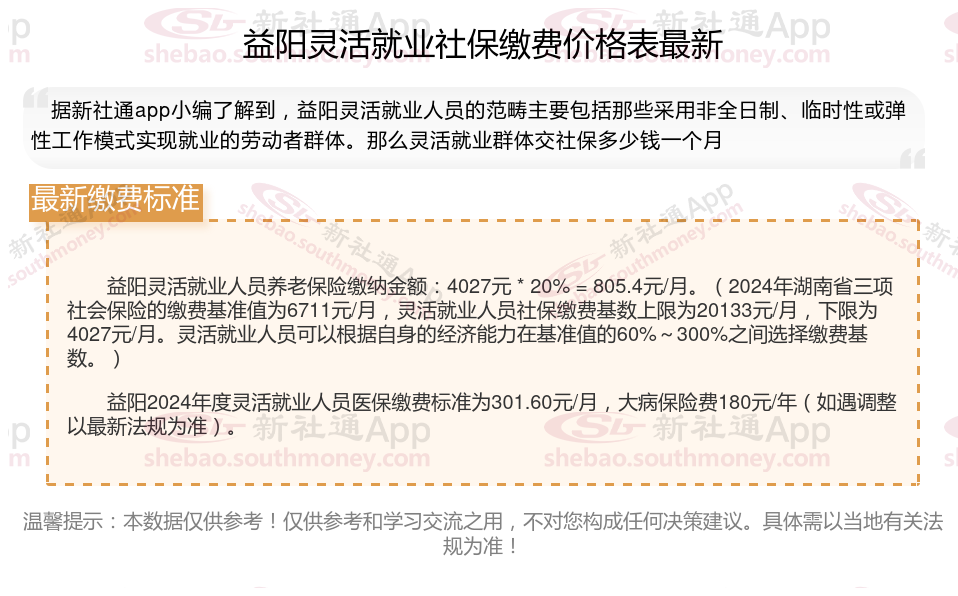 一、益阳灵活就业社保缴费标准表2024年 益阳灵活就业社保多少钱一个月?