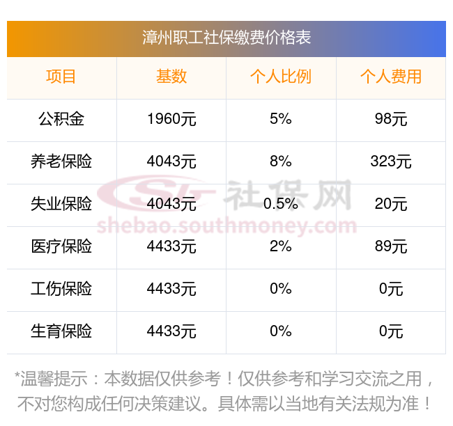 2025年漳州社保缴费价格标准是多少,2025年漳州社保缴费多少钱?下表是2025年漳州社保费用明细参考,新社通app-社保缴费查询工具提供的最新数据如下: