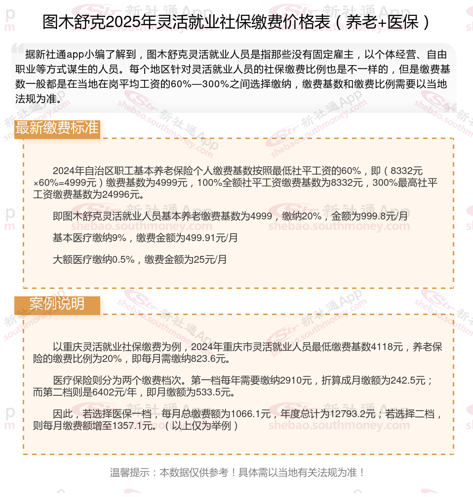 图木舒克灵活就业社保缴费标准来了 灵活就业社保最低要交多少钱?根据新社通app-社保缴费查询工具提供的最新数据如下: