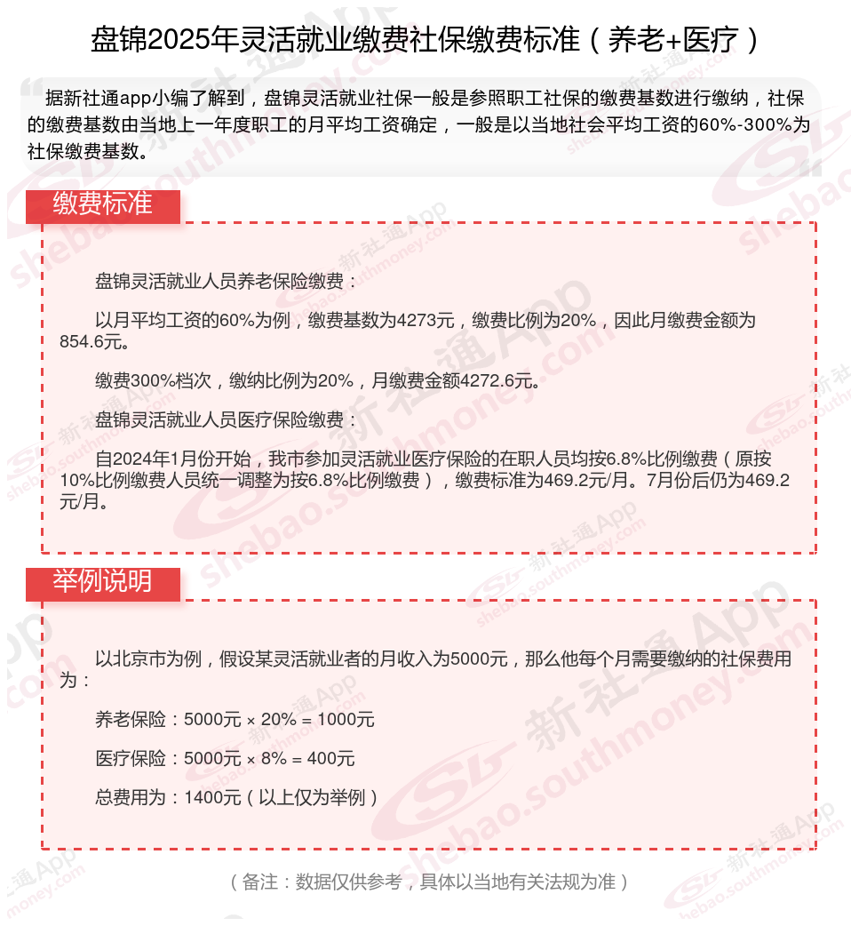 据新社通app数据显示,盘锦灵活就业养老保险最低缴费基数为:4273元;个人的缴费比例分别为:20%;
