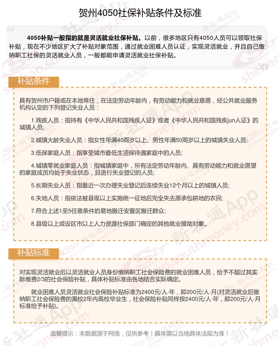 一、2025年贺州灵活就业4050社保补贴标准和条件是什么
