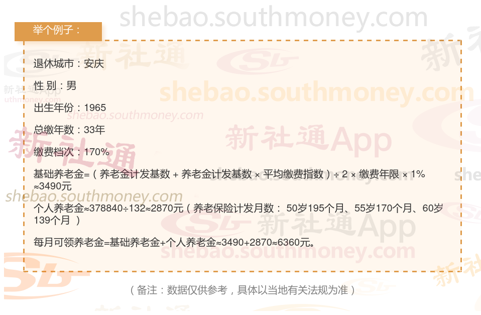 退休城市:安庆,性别:男,出生年份:1965,总缴年数33年,缴费档次:170%,新社通app养老金计算器所得: