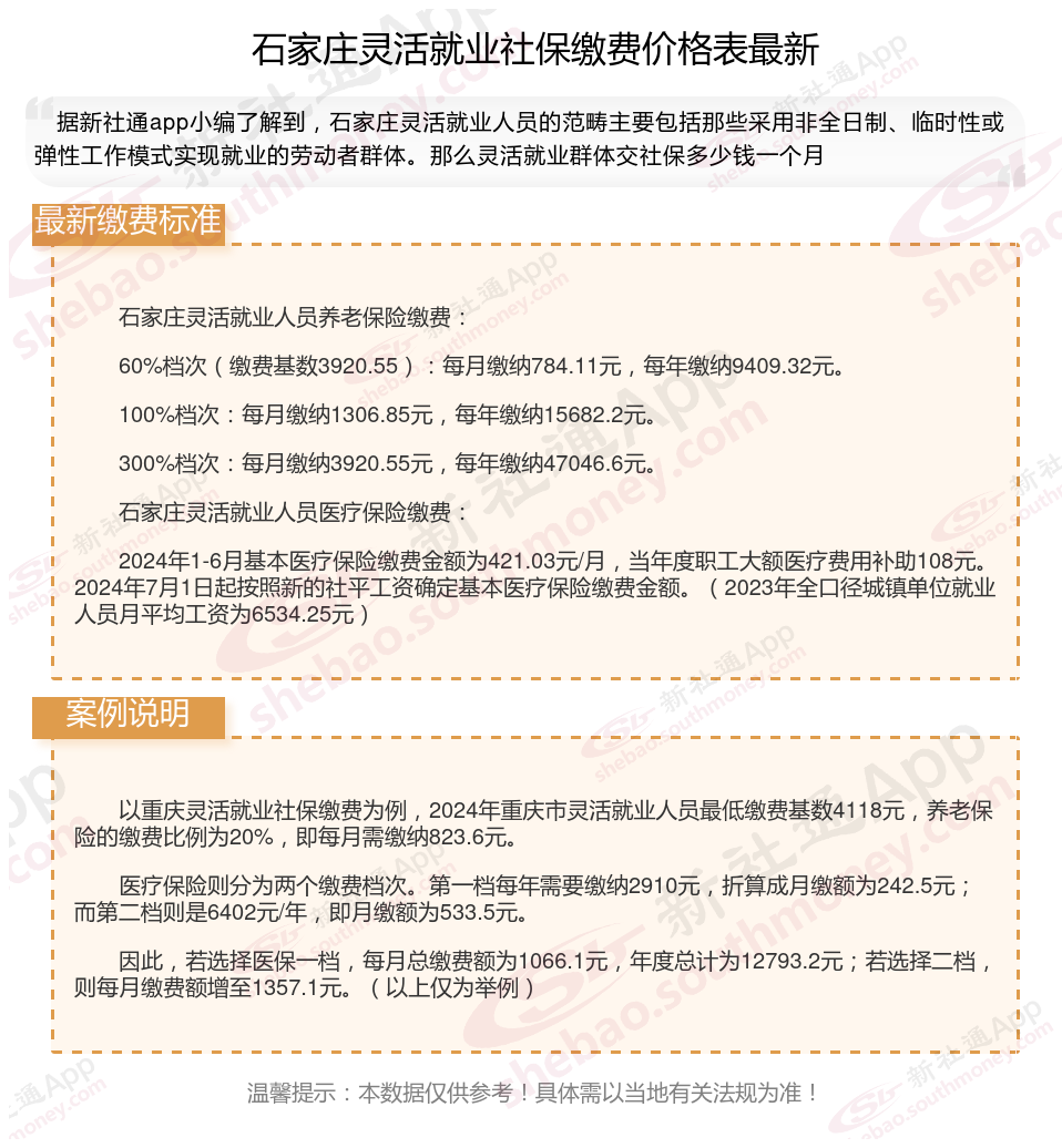 据新社通app数据显示,2024-2025年石家庄灵活就业人员养老保险的缴费标准是根据缴费基数来确定的: