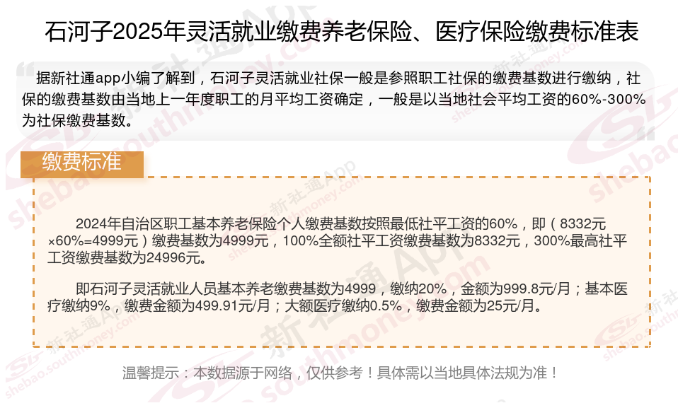 石河子灵活就业社保缴费标准,石河子社保缴费多少钱?下表是2024-2025年石河子社保费用明细参考,根据新社通app-社保缴费查询工具提供的最新数据如下: