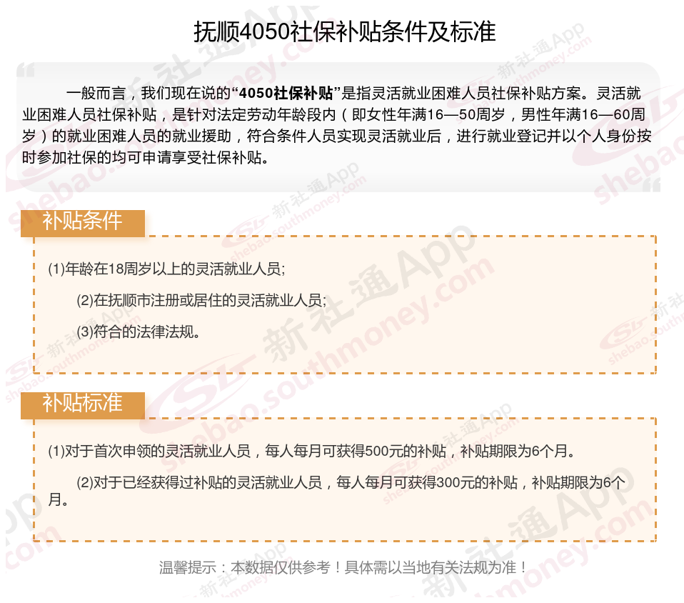 今天聊一下4050补贴的相关内容。4050补贴听起来像是一个针对特定年龄人群的社保补贴。比如女性需年满40周岁,男性需年满50周岁(以申请当年12月31日为截止日期)。那么抚顺4050灵活就业困难人员社保补贴多少钱?抚顺4050社保补贴可以申请吗?接下来随新社通APP小编具体了解一下4050社保补贴内容。