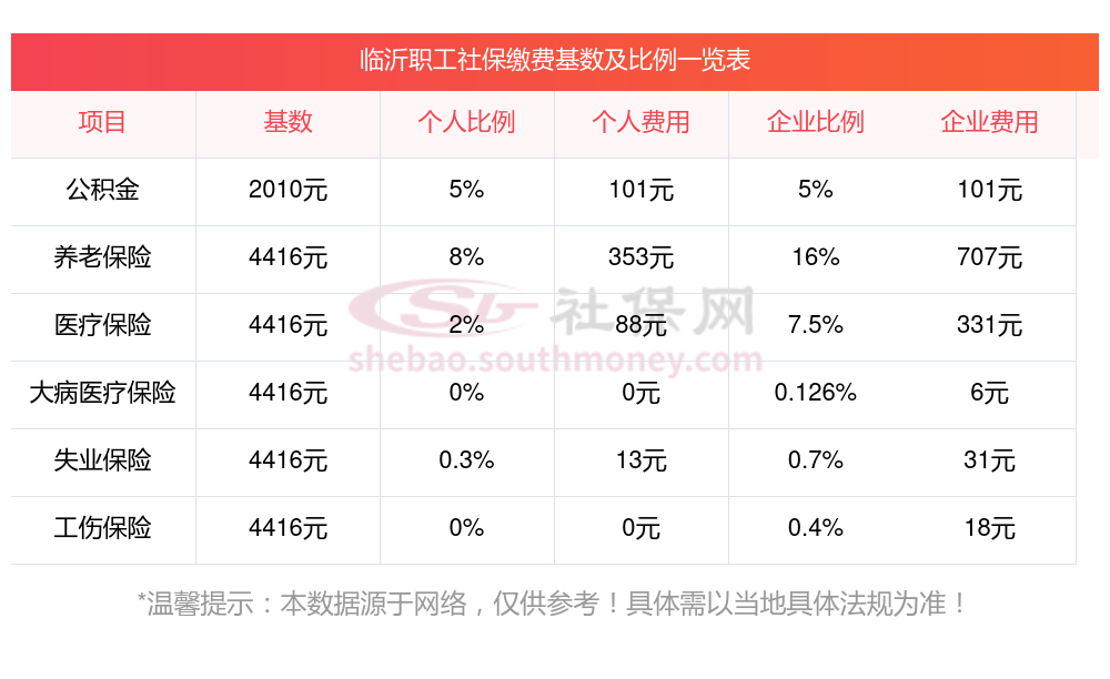 临沂五险要扣工资多少钱一个月?临沂缴费社保比例一览社保公司和个人各交多少?下表是2024-2025年临沂社保费用明细参考,新社通app-社保缴费查询工具提供的最新数据如下: