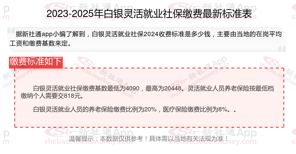 那么,自由职业社保是多少钱一个月 白银灵活社保交多少钱?根据新社通app-社保缴费查询工具提供的2025社保缴费标准详情数据: