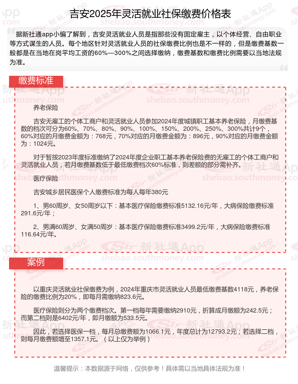 在吉安,那些选择独立参保的灵活就业者,包括个体户和自由职业者,现在有机会加入企业职工基本养老保险体系。根据法规,这些参保者可以根据自身情况,在全省城镇单位就业人员平均工资的60%至300%范围内,挑选最适合自己的缴费基数。那么,关于吉安2025年灵活就业人员的社保缴费标准是多少?以及每月需要缴纳的社保费用是多少,本文将为您提供最新的信息。