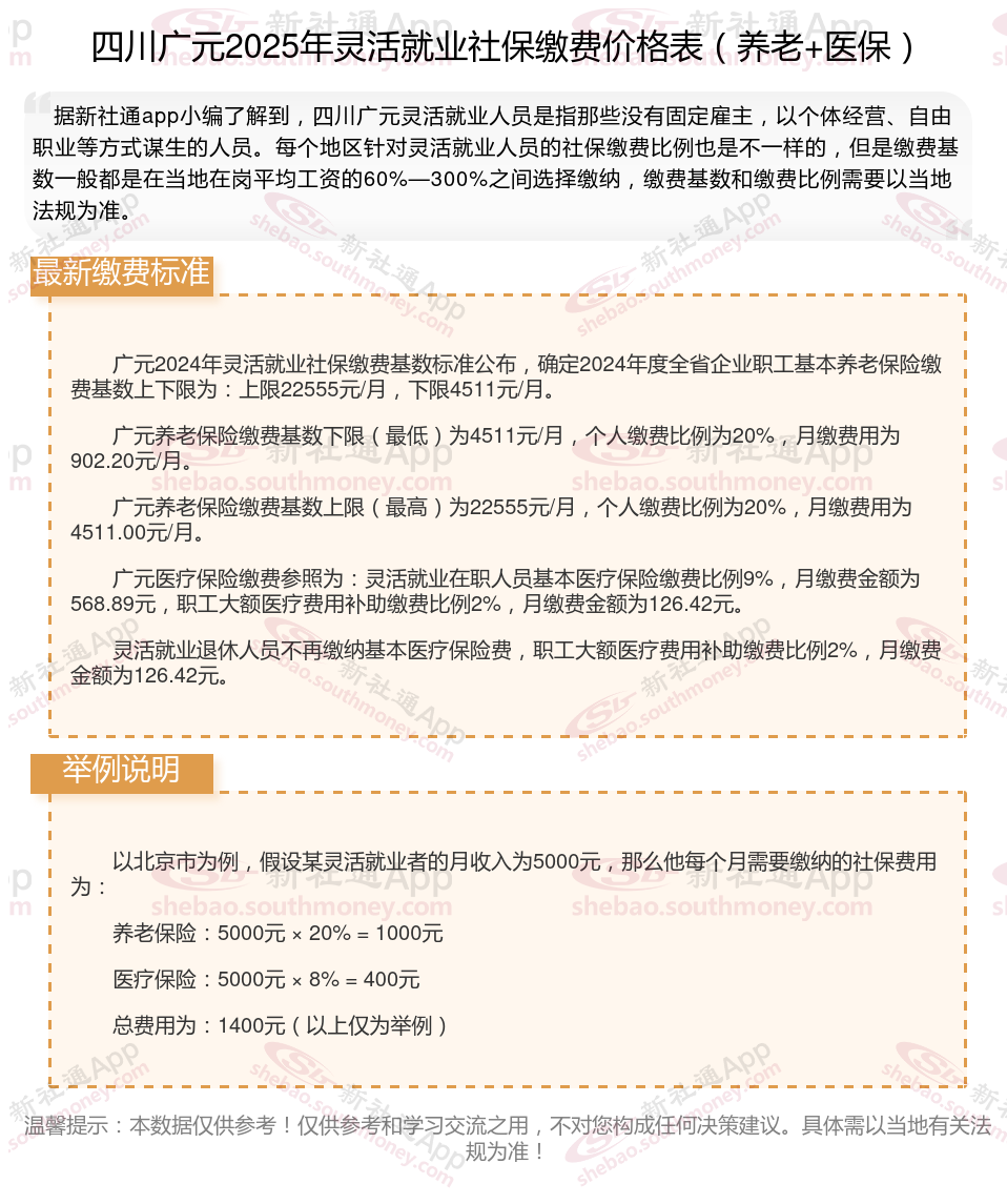 灵活就业人员自己交保险一个月多少钱?四川广元自由职业社保缴纳金额是怎么计算?根据新社通app-社保缴费查询工具提供的最新数据如下: