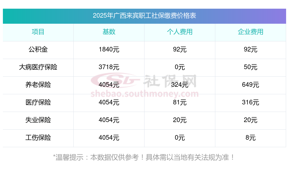 2025年广西来宾社保缴费最新标准是多少?新社通app-社保缴费查询工具提供的最新数据如下: