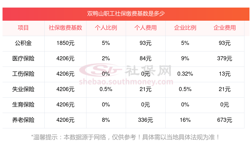 黑龙江社保个人怎么交费?黑龙江社保个人交多少钱?下表是2024-2025年双鸭山社保费用明细参考,新社通app-社保缴费查询工具提供的最新数据如下: