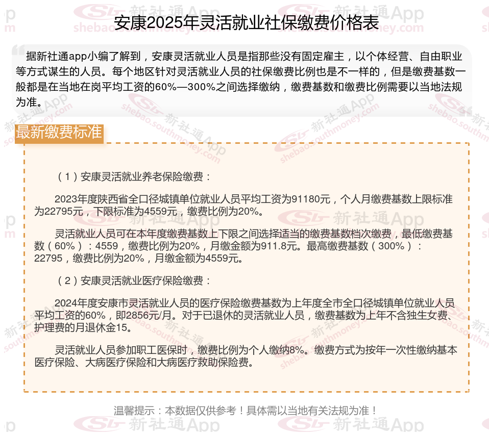 灵活就业社保是指针对灵活就业人员的社会保险制。灵活就业人员包括个体经营者、自由职业者、临时工等,他们没有固定的雇主,因此需要自行缴纳社会保险。那么2025年安康灵活就业人员社保需要交多少钱?下面随新社通小编一起来看看。