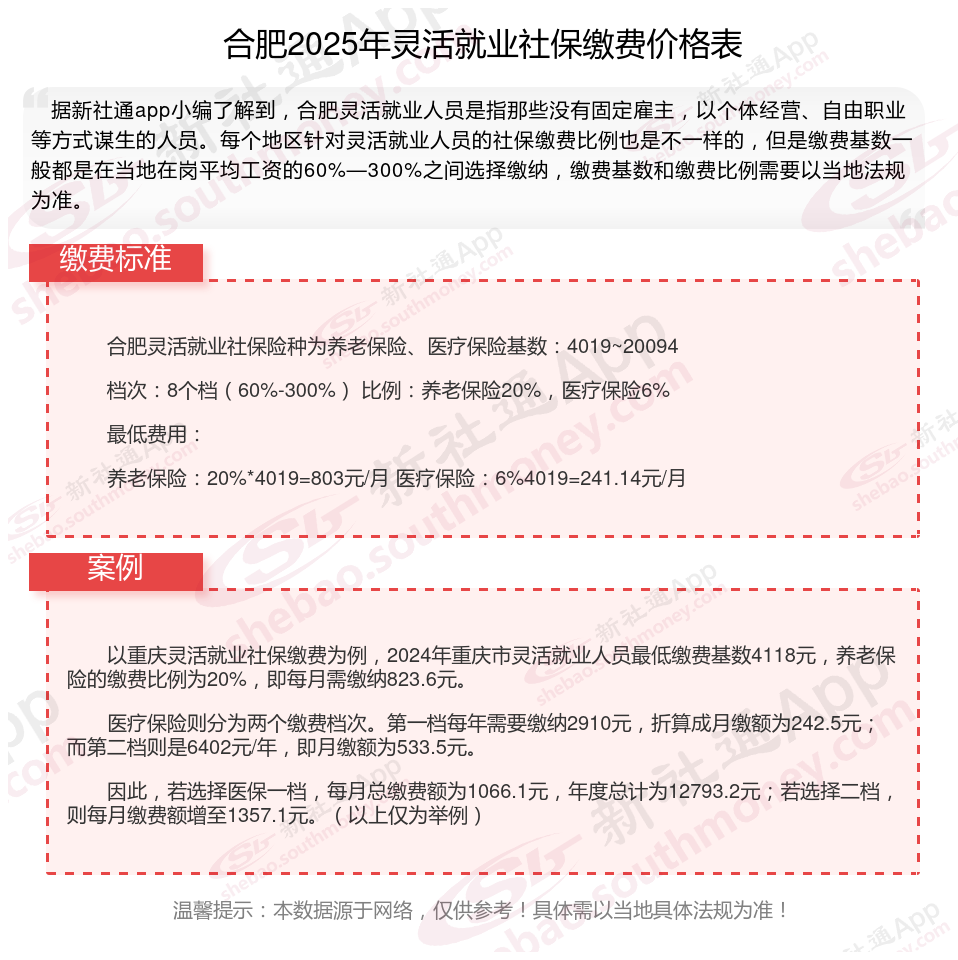 2025年合肥灵活就业人员社保需要交多少钱?灵活就业社保通常只需缴纳养老和医疗两项(部分地区可自愿选缴失业险),其他险种无需强制缴纳。灵活就业社保缴费满15年后,退休后可领取养老金,避免老年无收入来源。接下来随新社通APP小编一起来看看合肥灵活就业人员社保缴费的内容。