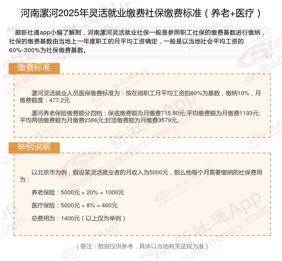 缴费标准最新公布!河南漯河2024-2025年度灵活就业社保缴费基数明细来了,根据新社通app-社保缴费查询工具提供的2025社保缴费标准详情数据: