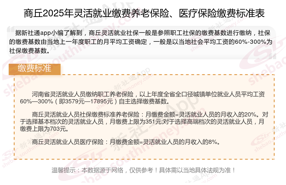 据新社通app数据显示,商丘灵活就业养老缴费基数明细如下: