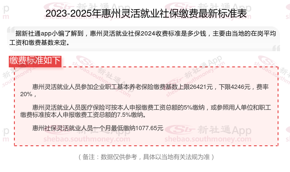 据新社通app数据显示,惠州灵活就业人员养老保险缴费基数2024-2025年最新标准如下: