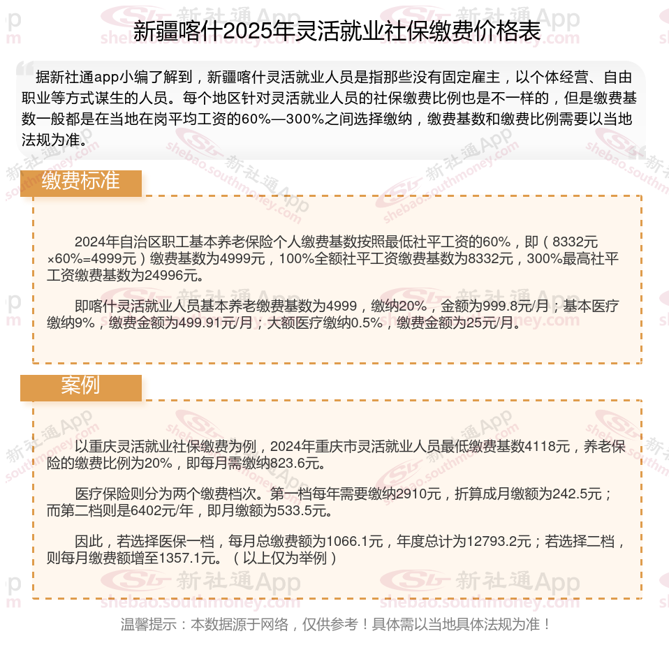 据新社通app数据显示,新疆喀什灵活就业人员养老缴费基数2024-2025年最新标准如下: