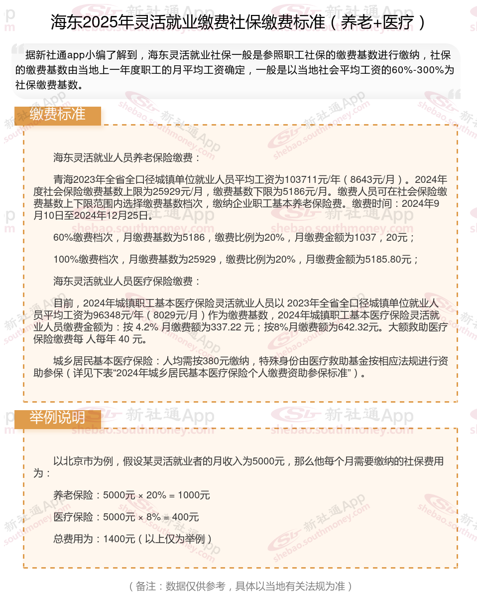 2025灵活就业社保缴费标准的调整,既体现了法规的连续性,又适应了经济社会发展的要求。灵活就业人员应根据自身情况,合理选择缴费基数和缴费比例,确保自身权益得到充分保证。那么2025年海东灵活就业人员社保需要交多少钱,你了解2025年海东灵活就业人员社保缴费基数及比例吗,接下来随新社通APP小编一起来看看。