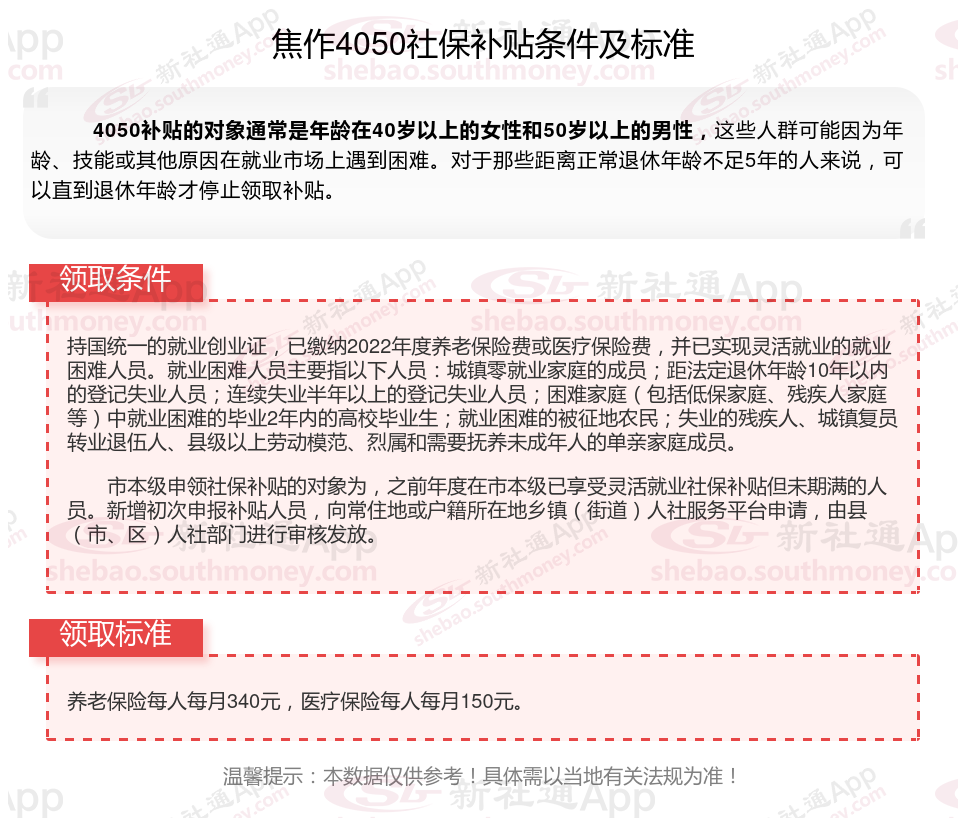 焦作4050灵活就业社保补贴是什么?今天聊一下4050补贴话题。4050补贴听起来像是一个针对特定年龄人群的社保补贴。比如女性需年满40周岁,男性需年满50周岁(以申请当年12月31日为截止日期)。那么焦作4050灵活就业社保补贴标准是多少钱?焦作4050社保补贴可以领取多少?接下来随新社通APP小编了解一下焦作4050灵活就业社保补贴的最新资讯。