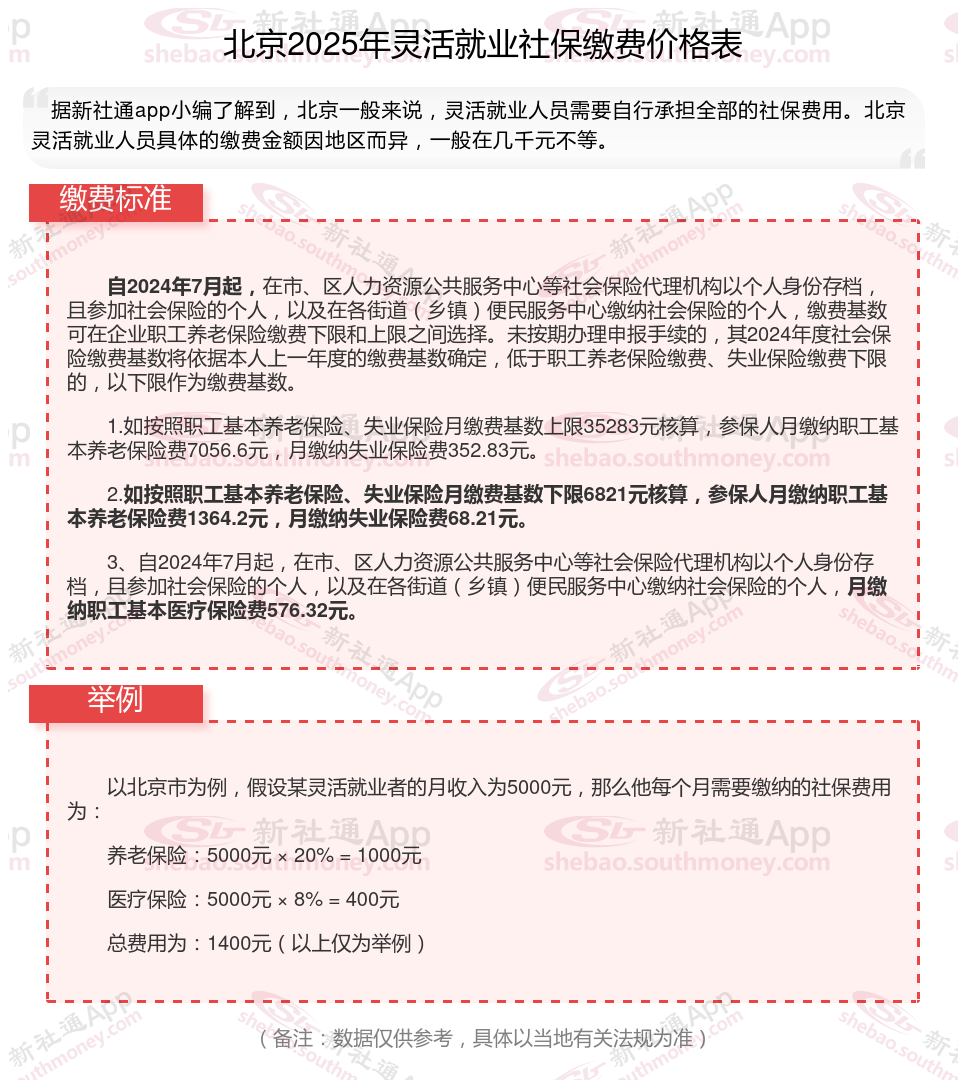 北京灵活就业社保交多少钱?最新北京灵活就业人员社保养老缴费标准明细来了,根据新社通app-社保缴费查询工具提供的2025社保缴费标准详情数据: