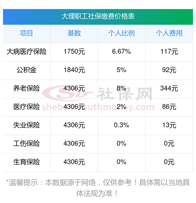 大理个人最低五险一金自己交多少?最低档位社保交多少钱?下面和社保丫丫一起来了解下2024-2025年大理最低配社保费用明细参考,新社通app-社保缴费查询工具提供的最新数据如下: