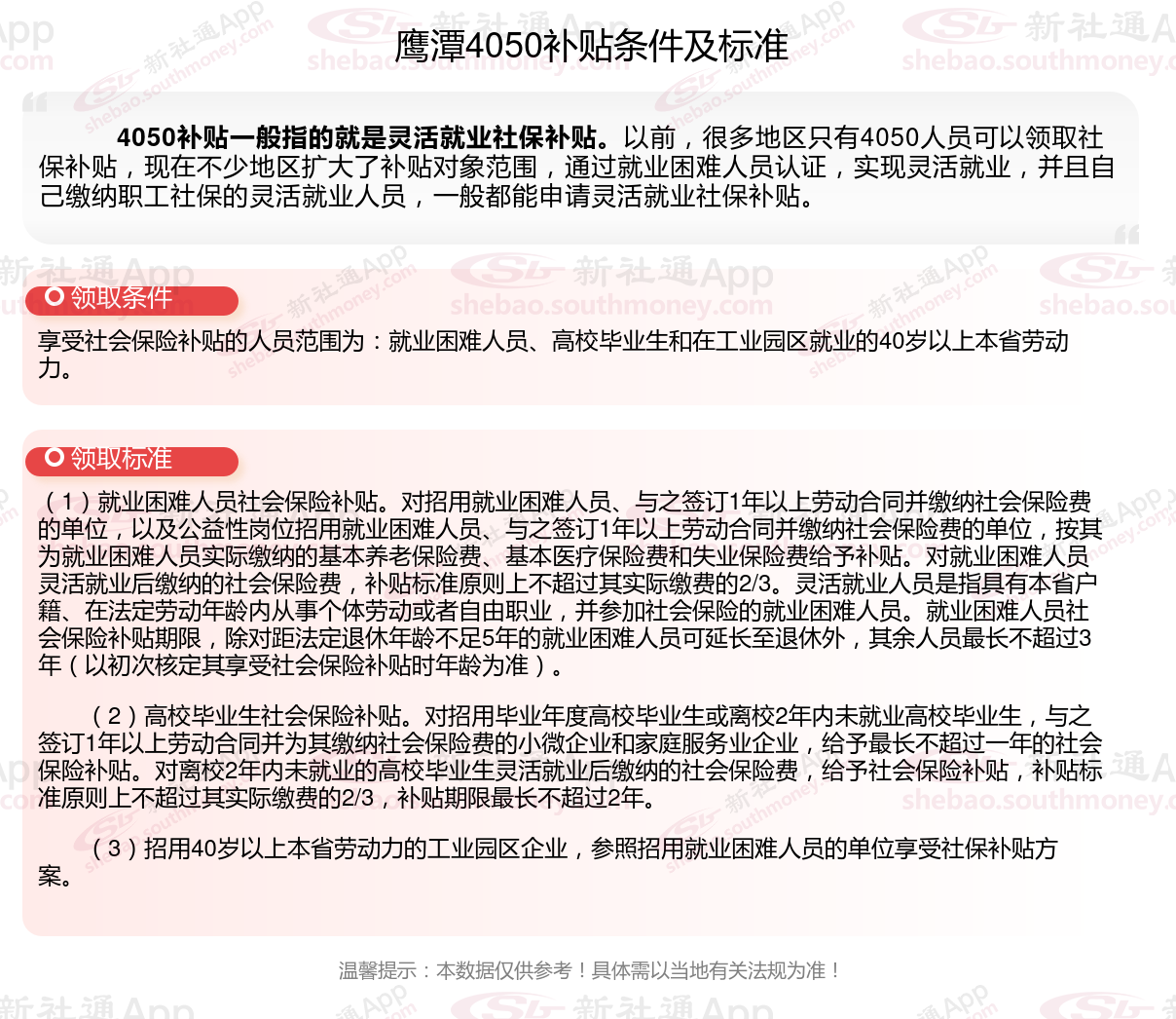 以上就是鹰潭4050灵活就业困难人员社保补贴的相关内容,欢迎关注新社通/下载新社通APP了解更多五险一金专业资讯。
