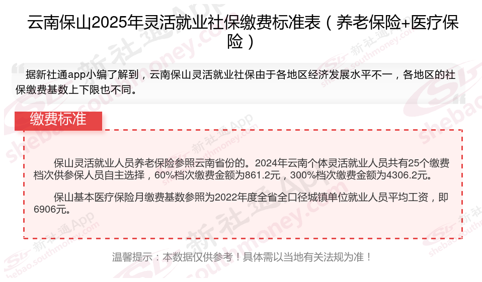 据新社通app数据显示,2024-2025年云南保山灵活就业人员养老保险的缴费标准是根据缴费基数来确定的: