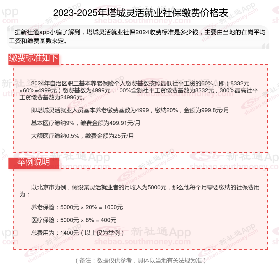 2025年塔城城镇职工社会保险缴费基数用人单位及其职工(包括有雇工的个体工商户及其雇工)分别按2024年度全口径省平的60%(4999元/月)和300%(24996元/月)核定缴费基数的下限和上限执行。
