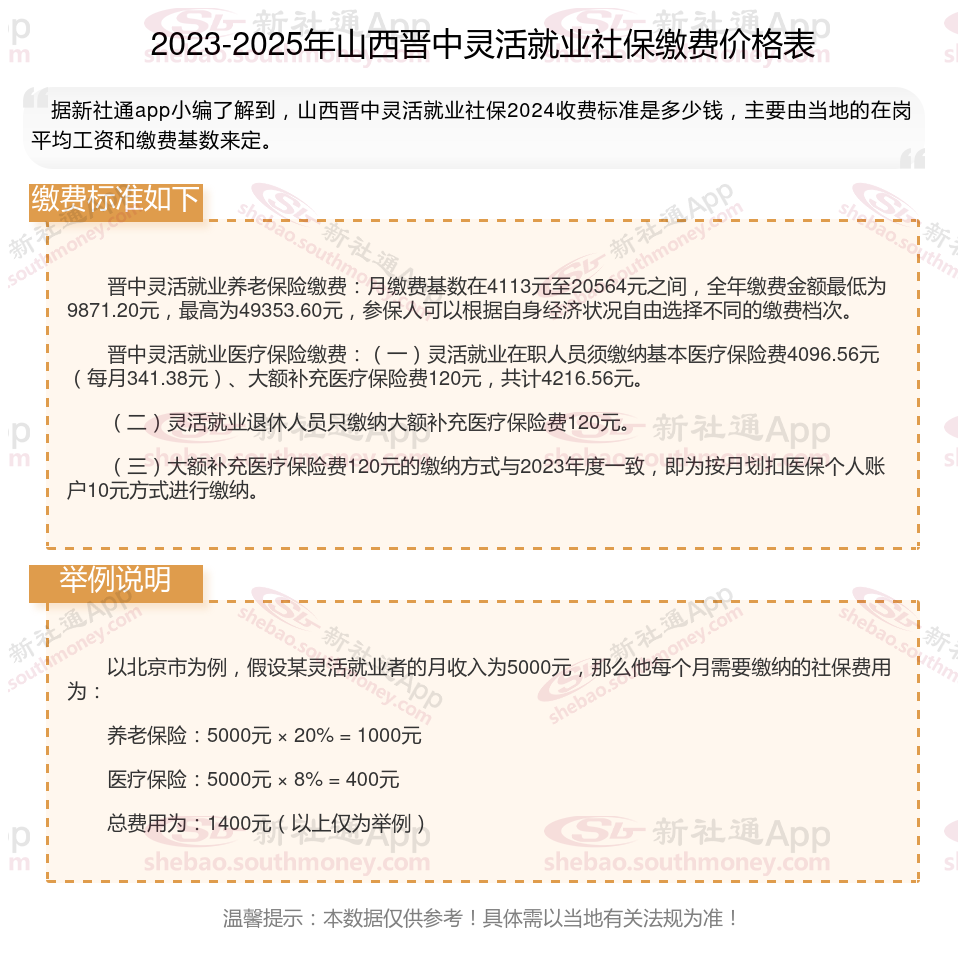 那么,山西晋中灵活就业社保缴费标准是多少?个体户社保,要交多少钱一个月?根据新社通app-社保缴费查询工具提供的2025社保缴费标准详情数据: