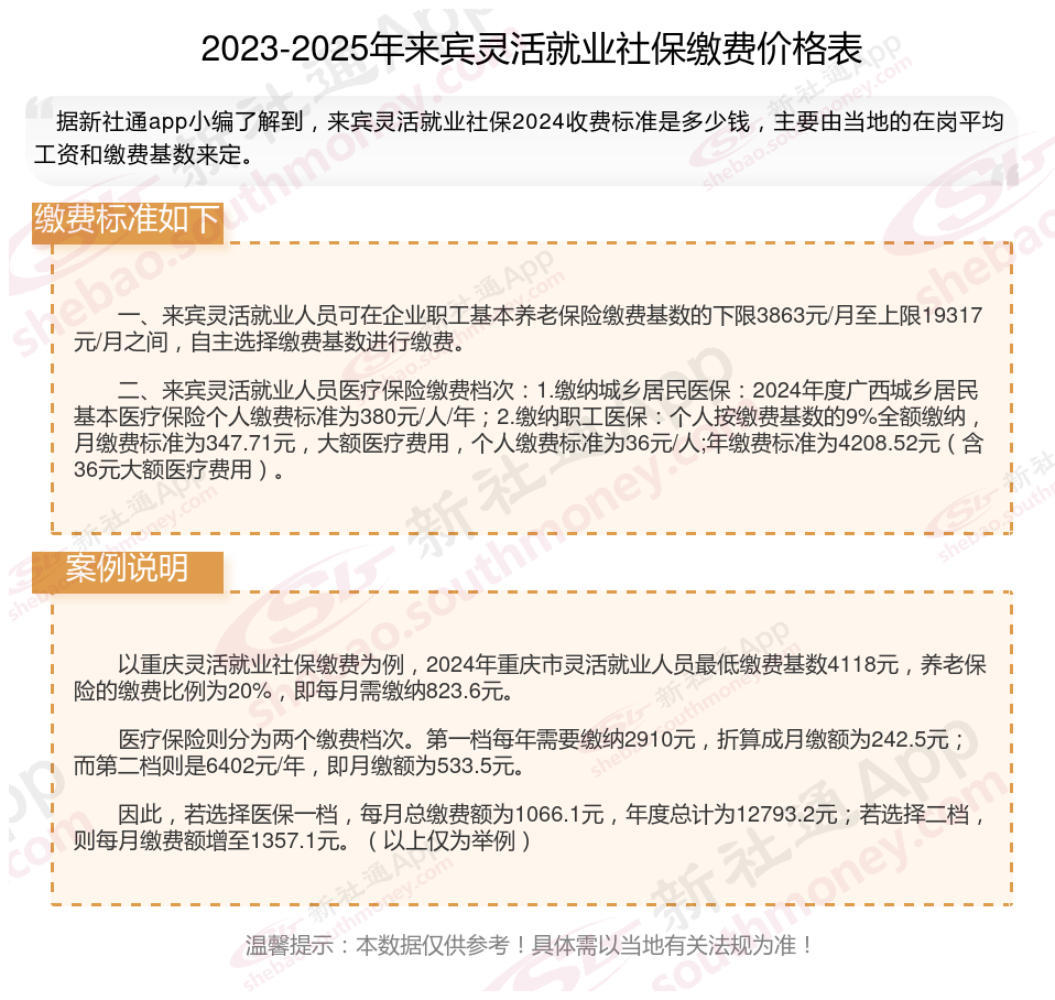 2024-2025年来宾灵活就业人员社保缴费标准是多少?社保交完退休能领多少钱?下表是2024-2025年来宾社保费用明细参考,根据新社通app-社保缴费查询工具提供的最新数据如下:
