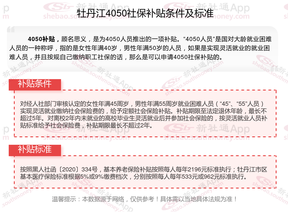 4050社保补贴标准据新社通app小编了解,通常,4050社保补贴包含基本医疗保险和基本养老保险两个险种,社保补贴金额为申请人实际缴纳基本养老保险和基本医疗保险金额的2/3,具体标准以当地社保局公布的数据为准!那么牡丹江灵活就业人员4050补贴最新标准是多少,牡丹江4050灵活就业人员社保补贴一年可以有多少钱?接下来随新社通APP小编具体了解一下4050社保补贴内容。