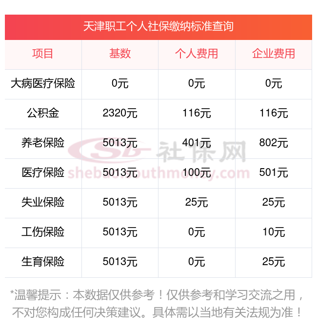 据新社通app小编了解到,2025年天津社保缴费基数参照为3579.00,天津社保缴费明细如下: