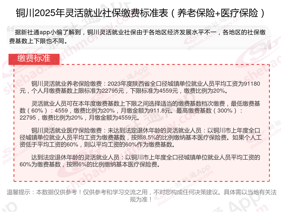 据新社通app数据显示,铜川灵活就业养老保险缴费基数2024-2025年最新标准如下: