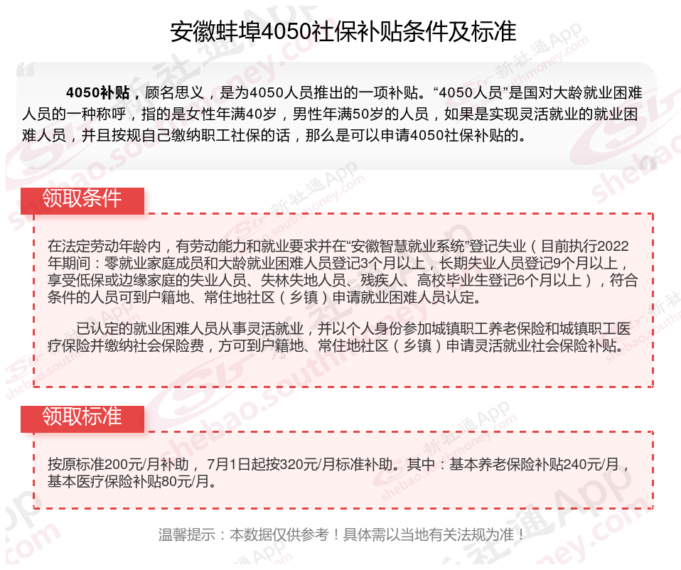 “灵活就业4050社保补贴”是指灵活就业困难人员社保补贴。该方案是对就业困难人员灵活就业后办理了就业登记手续并参加社会保险的,给予社会保险补贴。那么安徽蚌埠4050灵活就业困难人员社保补贴标准是多少?安徽蚌埠4050社保补贴需要符合什么条件?接下来随新社通APP小编了解一下最新资讯。