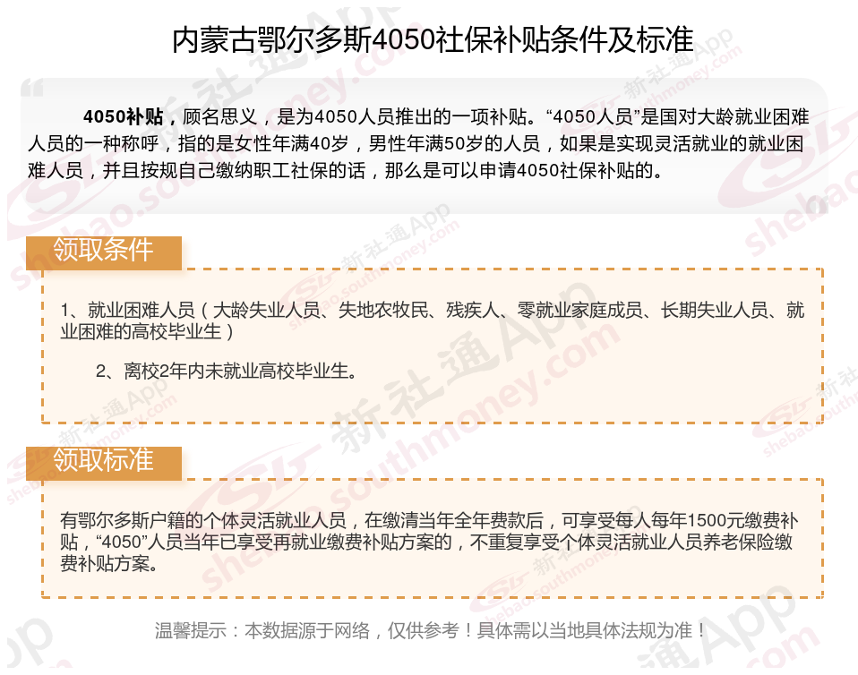 2025内蒙古鄂尔多斯4050补贴主要针对的是年龄在40岁以上的女性和50岁以上的男性,这些人群通常因为年龄较大而面临就业困难。
