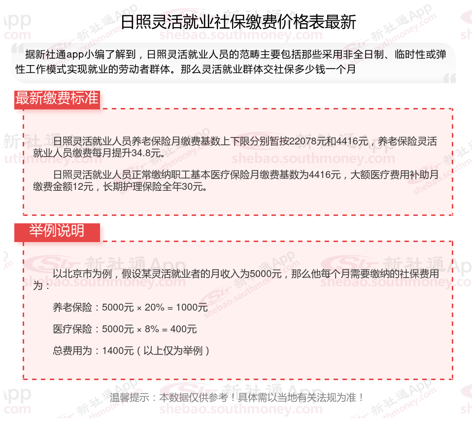 据新社通app数据显示,2024-2025年日照灵活就业人员养老保险的缴费标准是根据缴费基数来确定的:
