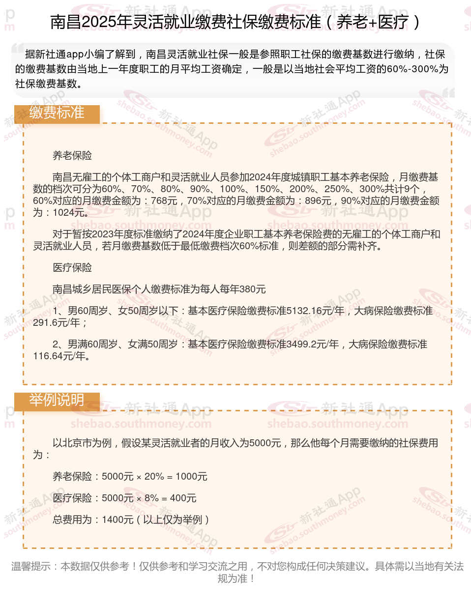 据新社通app数据显示,南昌灵活就业养老保险缴费基数2024-2025年最新标准如下: