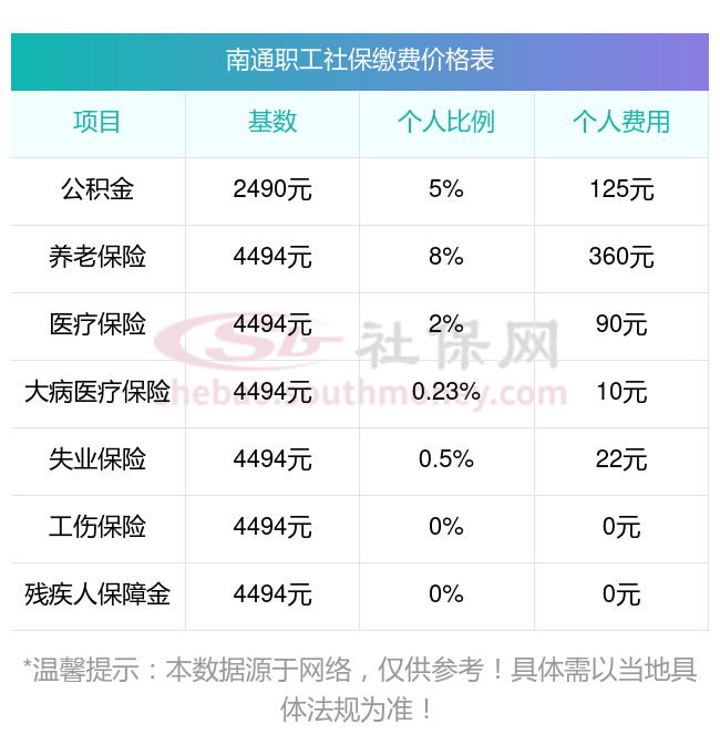 2025年南通社保缴费多少钱?南通社保公积金缴费基数为:3579.00元,个人比例 : 0.08,下表是2025南通社保费用明细参考,新社通app-社保缴费查询工具提供的最新数据如下: