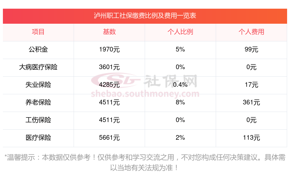 据新社通app小编了解,泸州社保缴费基数参照为3579.00,泸州社保最低一个月要交多少钱?如下: