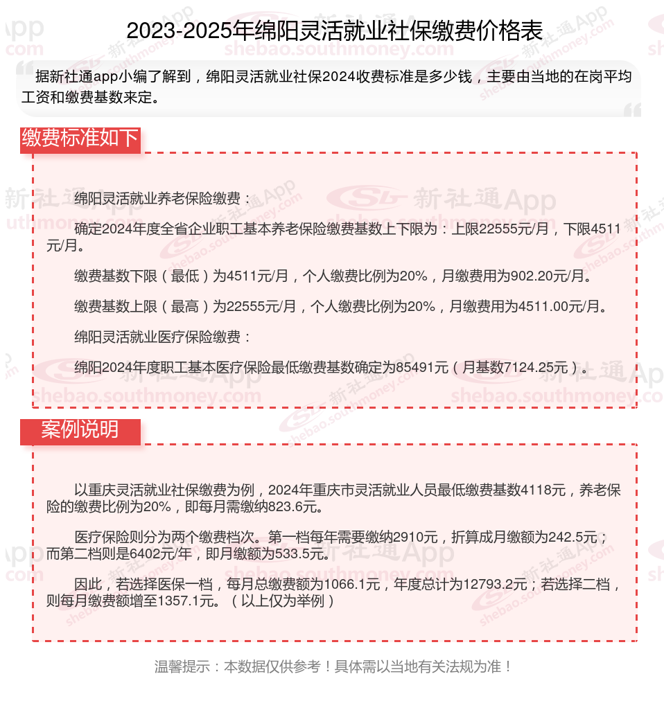 据新社通app数据显示,绵阳灵活就业养老缴费基数明细如下: